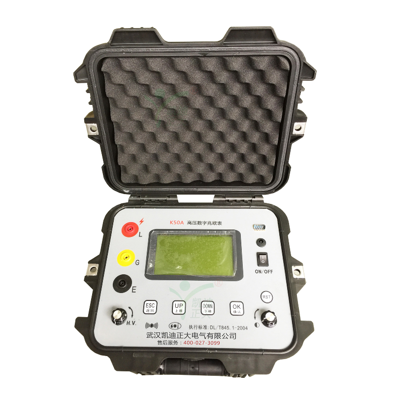 KD50A高壓絕緣電阻測試儀具有50V、100V、250 V、500V、1.0kV、2.5kV、5.0kV、10.0kV共8個電壓輸出檔,測試最大可達10TΩ。容量大、抗干擾強、液晶屏同步顯示、交直流兩用、操作簡單、自動計算各種絕緣指標、吸收比、極化指數(shù)、各種測量結(jié)果具有防掉電功能等特點。是測量大容量變壓器、互感器、發(fā)電機、高壓電動機、電力電容、電力電纜、避雷器等絕緣電阻的測試儀器。