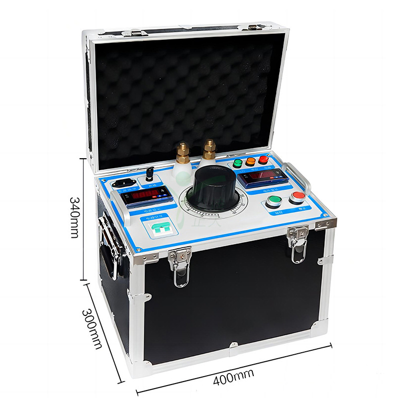 KDSL-82 1000A大電流發生器是一種作為檢驗用的電流源,大電流試驗器采用ARM芯片控制輸出工藝和大容量的環形變壓器,并且配有液晶屏顯示的表計,同時顯示一、二次電流、變比和秒表接點(或電位)的動作時間。外配鋁合金機箱,PC面板,具有外形美觀,輸出容量大,體積小,重量輕等特點。主要適用于電力系統的CT變比,接觸電阻等需要大電流試驗的場合。對電器作熱穩定、動穩定試驗時低壓大電流電源,如空氣斷路器、接觸器、繼電器的溫升試驗及脫扣等。