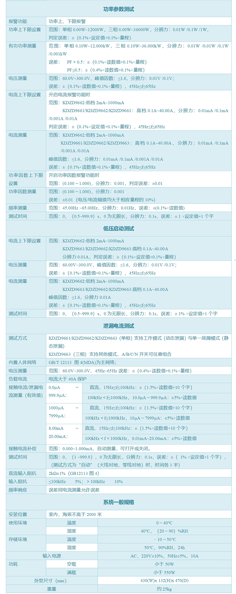 KDZD9661/KDZD9662/KDZD9663電氣安全性能綜合分析儀,涵蓋交流耐壓、直流耐壓、絕緣電阻、接地導通電阻、功率、啟動、泄漏電流、電弧偵測、開路偵測等功能于一體,大屏觸控,易學易用,精準高效,可靠穩定,接口豐富。