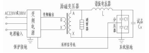 我們已知,在回路頻率f=1/2π√LC時,回路產(chǎn)生諧振,此時試品上的電壓是勵磁變高壓端輸出電壓的Q倍,Q為系統(tǒng)品質(zhì)因素,即電壓諧振倍數(shù),一般為幾十到一百以上。先通過調(diào)節(jié)變頻電源的輸出頻率使回路發(fā)生串聯(lián)諧振。再在回路諧振的條件下調(diào)節(jié)變頻電源輸出電壓使試品電壓達(dá)到試驗值,由于回路的諧振,變頻電源較小的輸出電壓就可在試品CX上產(chǎn)生較高的試驗電壓。
