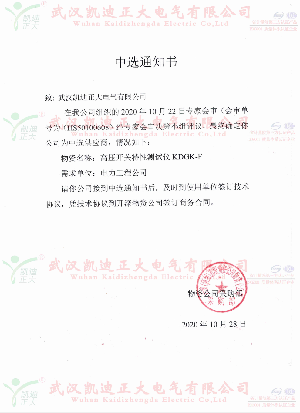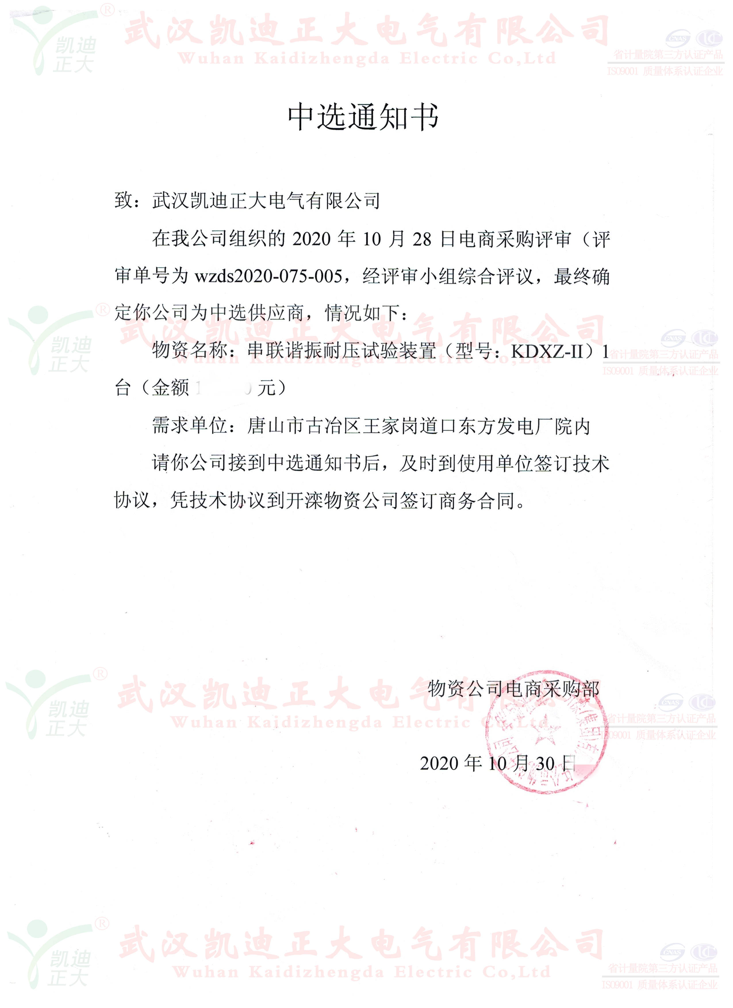 誰無暴風(fēng)勁雨時,守得云開見月明。這個11月可以說是灰蒙蒙的,經(jīng)歷了洗刷.......。我司與國內(nèi)大型鋼鐵企業(yè)的合作,各大煤業(yè)集團(tuán)均獲得訂單。這次是開灤集團(tuán)的東方電廠公開詢價采購KDXZ-II串聯(lián)諧振耐壓試驗裝置、KDGK-F高壓開關(guān)機(jī)械特性測試儀等設(shè)備。在與多家電氣設(shè)備制造商的競標(biāo)中,我司以優(yōu)質(zhì)口碑、多項專利技術(shù)、精準(zhǔn)售后等高分獲得評標(biāo)組的認(rèn)可。獲得中選供應(yīng)商。