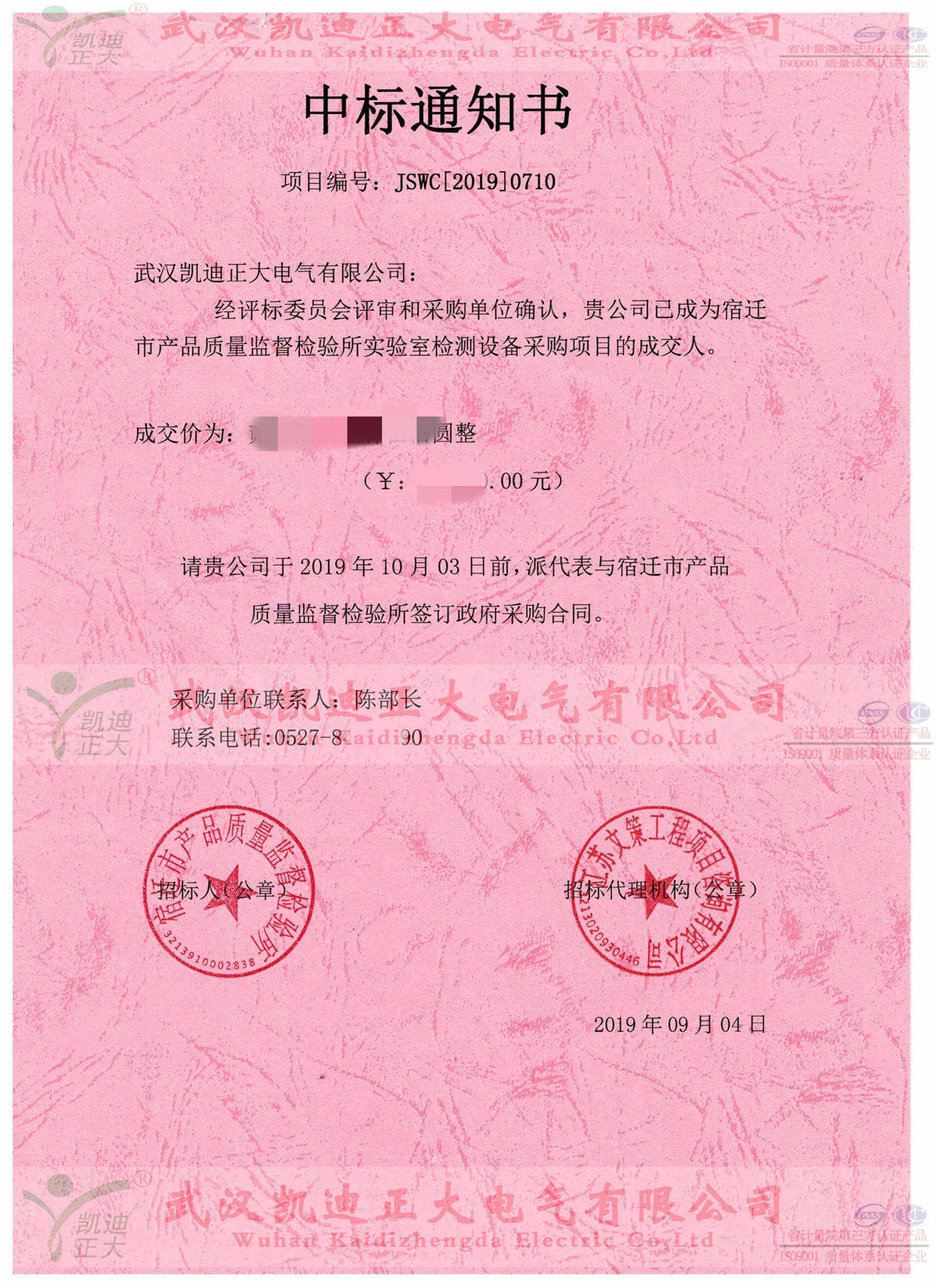 2019年9月份,受邀參與隸屬于宿遷市質量技術監督局的宿遷市產品質量監督檢驗所實驗室檢測設備采購項目,并以最高分獲得中標人。因武漢疫情等影響昨日收到宿遷質檢所的中標通知書。