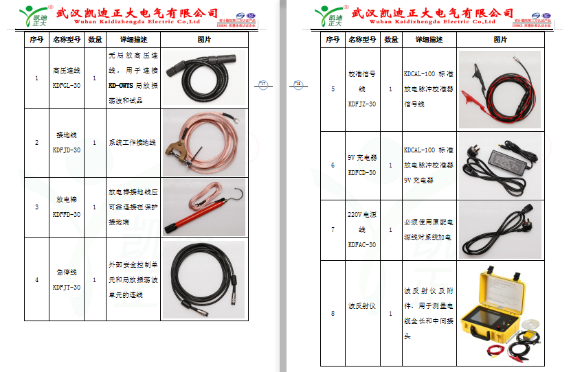 KD-OWTS配套附件如表4-1,現場試驗時須使用系統原配高壓連線、電源線和接地線進行連接,如線纜有缺損,需聯系廠家維修。