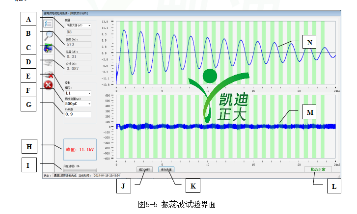K、數據保存按鈕 L、高壓單元狀態 M、局放波形顯示區域 N、振蕩波電壓波形顯示