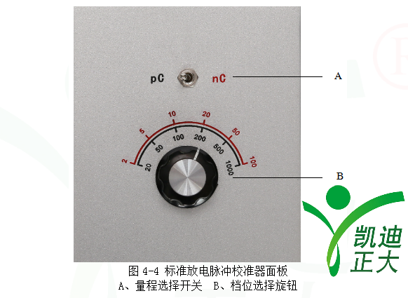 標準放電脈沖校準器提供20pC~100nC共十二檔標準放電脈沖,量程調節面板如圖4-4所示。使用時,首先通過量程選擇開關選擇pC或nC量程,然后通過檔位選擇旋鈕選擇相應的檔位。當量程選擇開關處于“pC”位置時,檔位選擇讀數為內圈(黑色)刻度,單位為pC;當量程選擇開關處于“nC”位置時,檔位選擇讀數為外圈(紅色)刻度,單位為nC。