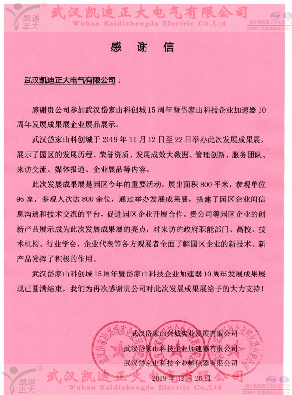 年關(guān)將至,凱迪正大公司收到一份來(lái)自岱家山科技企業(yè)加速器公司的感謝信,感謝我司的創(chuàng)新產(chǎn)品展示成為發(fā)展成果展的亮點(diǎn)。此次我司參展的創(chuàng)新產(chǎn)品有:KDHG-518B變頻互感器特性綜合測(cè)試儀、KDVLF-80kV超低頻交流耐壓試驗(yàn)裝置、KDJB-1200微機(jī)繼電保護(hù)測(cè)試儀等設(shè)備。來(lái)訪的政府職能部門、高校、技術(shù)機(jī)構(gòu)、行業(yè)協(xié)會(huì)、企業(yè)代表等參觀者共同見證了我們公司新產(chǎn)品的新技術(shù)。
