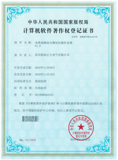 2019年,武漢凱迪正大電氣有限公司新力之作,榮獲中華人民共和國國家版權(quán)局《計算機軟件著作權(quán)登記證書》系統(tǒng)計算機軟件著作登記以及質(zhì)量管理體系認證證書,其中包含電纜故障綜合測試儀操作系統(tǒng)V1.0(證書號:軟著登字第3475878號)、氧化鋅避雷器帶電測試儀操作系統(tǒng)V1.0(證書號:軟著登字第3478045號)、高壓開關(guān)動作特性測試儀操作系統(tǒng)V1.0(證書號:軟著登字第3478053號)、變頻串聯(lián)諧振耐壓試驗裝置操作系統(tǒng)V1.0(證書號:軟著登字第3475581號)、電纜震蕩波局放定位系統(tǒng)操作系統(tǒng)V1.0(證書號:軟著登字第3475874號)等證書共計5份。權(quán)利取得方式:原始取得。權(quán)利范圍:全部范圍。