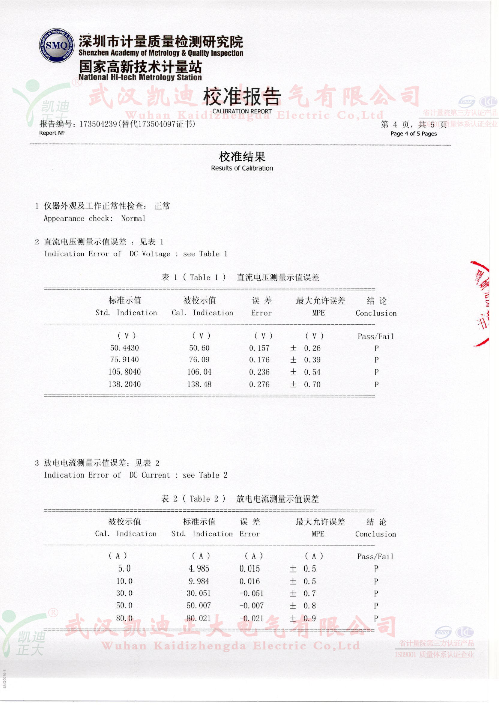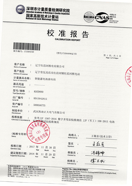 應中廣核遼寧紅沿河核電有限公司的需求,將武漢凱迪正大電氣公司生產(chǎn)的KDZD880(110V80A)智能蓄電池放電儀出具國家高新技術(shù)研究院的計量報告后才能使用。校準報告:173504097證書號,出廠編號:KD14122815,資產(chǎn)編號:500077905,校準依據(jù):參考JJF158-2016數(shù)字多用表校準規(guī)范JJF(軍工)108-2015電池充放電測試儀校準規(guī)范。嚴格出具檢定合格報告。