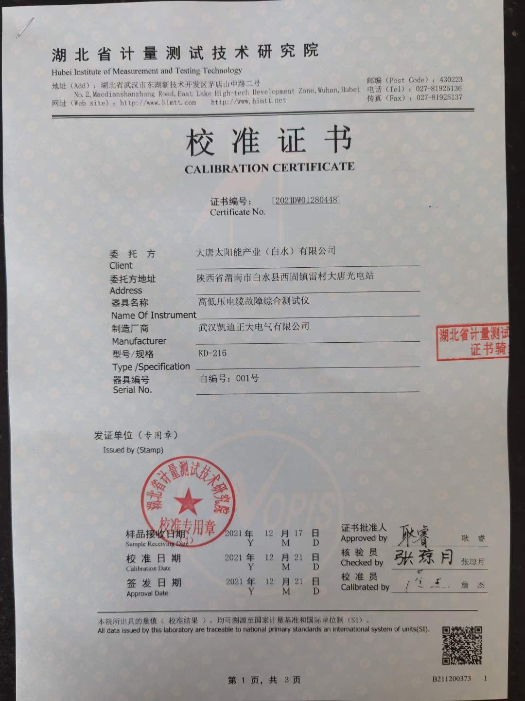 2021年12月22日,大唐太陽能產(chǎn)業(yè)(白水)有限公司采購我公司一批高低壓電纜故障綜合測(cè)試儀。為彰顯本公司產(chǎn)品的實(shí)力與質(zhì)量,凱迪正大雷總攜帶本公司生產(chǎn)的KD-216高低壓電纜故障綜合測(cè)試儀前往湖北省計(jì)量測(cè)試技術(shù)研究院中南國家計(jì)量測(cè)試中心對(duì)產(chǎn)品進(jìn)行檢測(cè),經(jīng)過多次測(cè)量與檢測(cè)后,產(chǎn)品完整通過每一條檢測(cè)并獲得了校準(zhǔn)證書。