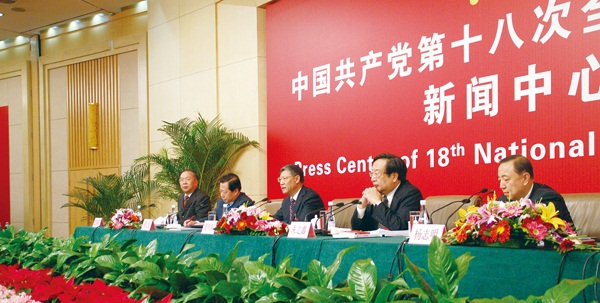 住房和城乡建设部党组书记、部长姜伟新(左三)在“十八大”中外记者招待会上介绍中国城乡住房建设工作情况