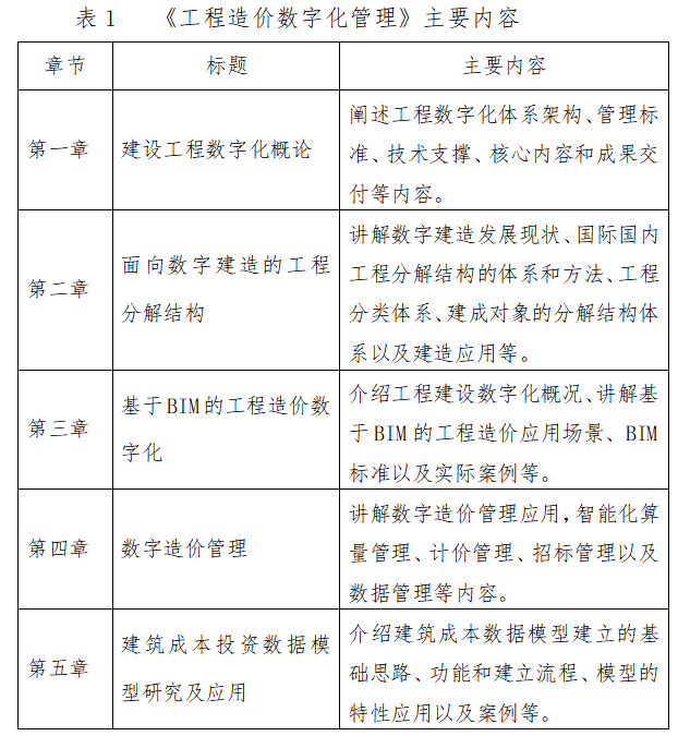 为加强工程造价专业人才培养,持续改进行业专业人才的知识结构,我协会组织有关高等院校、咨询企业以及软件企业等单位的专家、学者,共同研究编写了《2023年版全国一级造价工程师继续教育教材——工程造价数字化管理》,主要内容见表1。